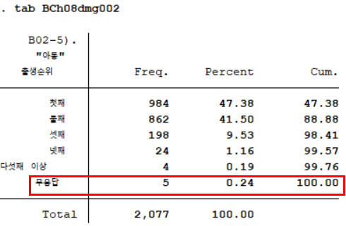 다시 분석으로 돌아와 "아동" 출생순위(BCh08dmg002)의 빈도분포표를 보도록 하자.