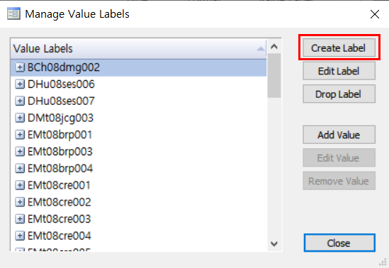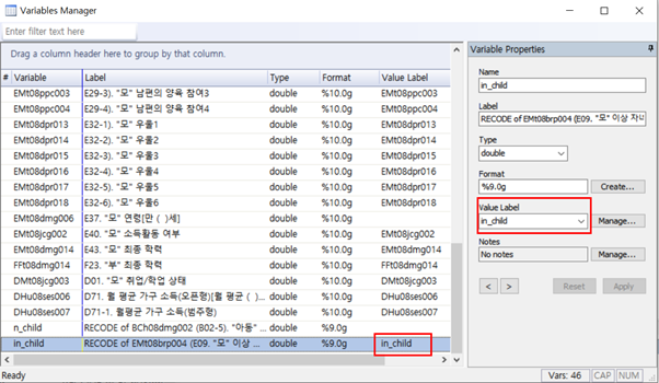 마지막으로 방금 생성한 in_child라는 labeling을 변수 in_child에 적용하기 위해 아래 사진과 같이 Variable Manger에서 Value Label을 in_child로 지정을 하거나 아래와 같은 명령어를 입력한다.