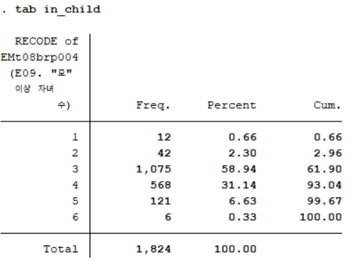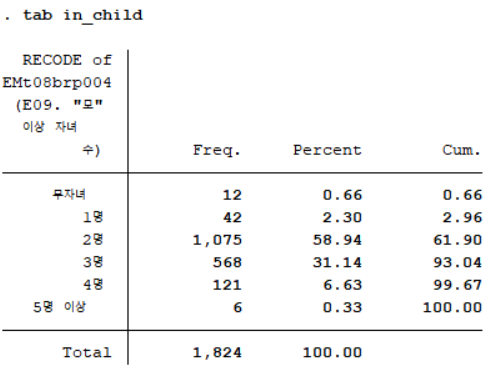 "모" 이상 자녀 수(EMt08brp004)를 리코딩하여 만든 'in_child'의 빈도분포표는 아래 사진과 같다.