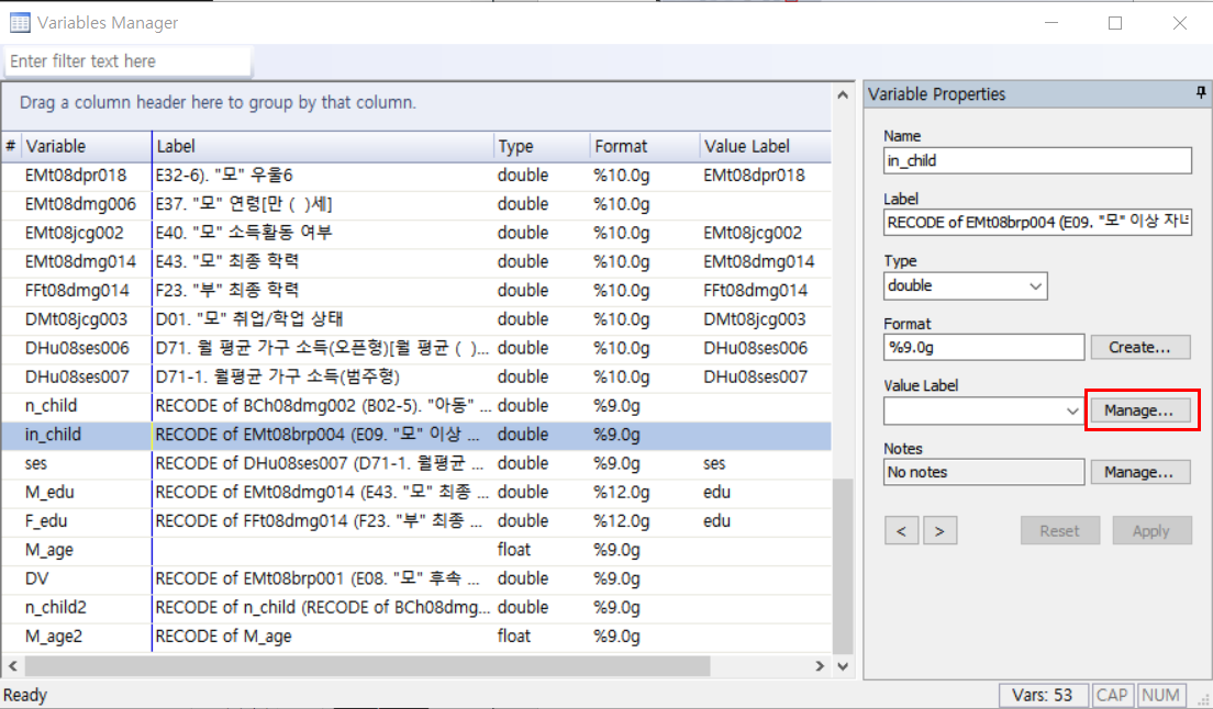 ⑩번 변수관리창을 클릭하면 아래 사진과 같은 화면이 뜬다. 이 중 나는 변수 'in_child'의 label을 정해줄 것이므로 빨간 네모로 표시된 Manage를 클릭한다.