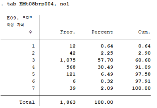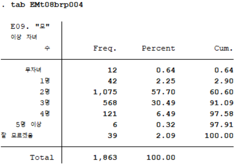 이상자녀수에 대한 빈도분포표를 얻기 위해 사용할 변수는 "모" 이상 자녀 수(EMt08brp004)이다. 먼저 명령어 tab을 이용해 해당 변수의 응답이 어떻게 코딩되어 있는지 살펴보자.