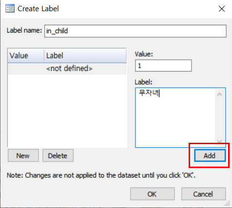 위의 사진에서 Manage를 클릭하면 아래 제일 왼쪽과 같은 화면이 뜨는데, 거기서 Create Label 아이콘을 클릭하면 중간 사진과 같은 화면이 뜬다. 중간 사진에서 Value는 변수값, Label은 변숫값에 해당하는 label을 의미한다. 무자녀 1, 1명 2, 2명 3, 3명 4, 4명 5, 5명 이상 6으로 코딩을 해주어야 하므로 맨 오른쪽 사진과 같이 입력을 해준 뒤 빨간 네모로 표시된 OK를 누르면 된다.