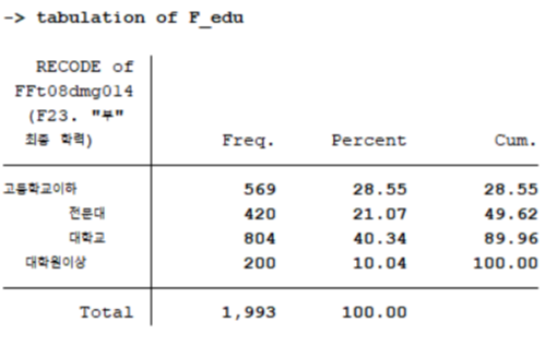 부모학력에 대한 빈도분포를 알기 위해 사용할 변수는 "모" 최종학력(EMt08dmg014), "부" 최종학력(FFt08dmg014)이다. 두 변수 모두 기존 응답 범주가 무학(1), 초등학교 졸(2), 중학교 졸(3), 고등학교 졸(4), 전문대 졸(5), 대학교 졸(6), 대학원 석사 졸(7) 대학원 박사 졸(8), 무응답(99999999)으로 구성되어 있다. 하지만 서미정(2011)은 응답 범주를 수정하여 고등학교 이하, 전문대(기능대학), 대학교, 대학원이상으로 나타냈으므로 이에 맞게 변수를 리코딩한다.
