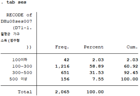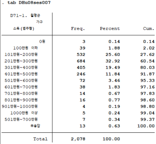 가구소득에 대한 빈도분포표를 얻기 위해 사용할 변수는 월평균 가구 소득(범주형)(DHu08ses007)이다. 먼저 명령어 tab을 이용해 해당 변수의 응답이 어떻게 코딩되어 있는지 살펴보자.