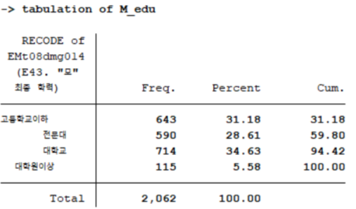 두 변수 모두 동일한 응답 범주를 가지므로 "edu"라는 변수 label을 동일하게 적용할 수 있다. 즉, 고등학교 이하는 1, 전문대는 2, 대학교는 3, 대학원이상은 4로 label을 만든 뒤 두 변수(M_edu, F_edu)에 같이 적용해주면 된다. 이를 명령어로 정리하면 아래와 같다.