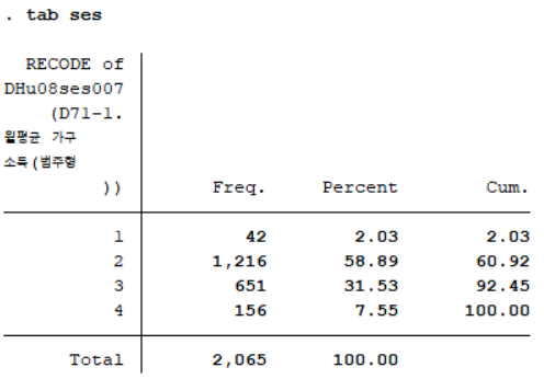DHu08ses007를 리코딩하여 새로운 변수 ses를 생성하였으며, ses의 빈도분포는 아래 사진과 같다.