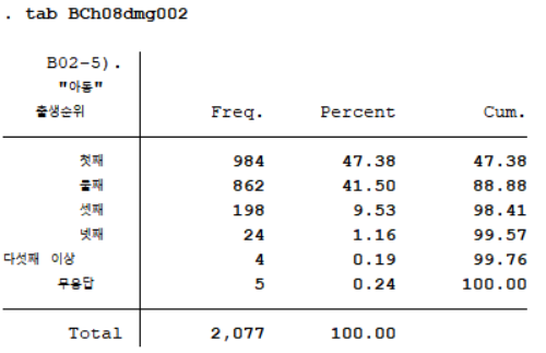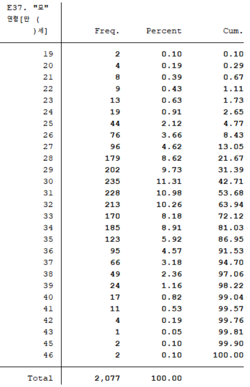 그런데 다시 <표 2>를 살펴보면 후속 출산 계획뿐만 아니라 자녀수와 모 연령의 응답범주도 기존 데이터와 일치하지 않는다는 사실을 알 수 있다. 기존 데이터에서 자녀수는 1명, 2명, 3명, 네명, 다섯명 이상, 무응답으로 분류되어 있으며, 어머니 연령은 연속변수로 응답하게 되어있다. 따라서 논문과 같이 분석을 진행해주기 위해서는 자녀수와 모 연령의 응답범주도 수정을 해주어야 한다.