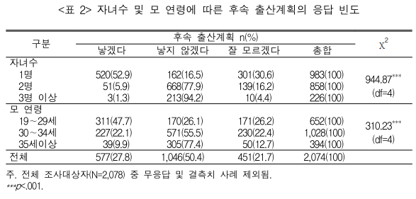 서미정(2011)은 부모의 심리사회적 특성 변인이 후속 출산계획에 미치는 영향력을 검증하기에 앞서 통제변인인 자녀수, 가구소득, 부모학력, 어머니의 연령과 취업 여부에 따라 후속 출산계획에 차이가 있는지를 살펴보았다. 이 중 유의미한 차이를 보인 통제변수가 자녀수와 어머니의 연령으로 이에 대한 교차분석을 따라 실시해보도록 하겠다.