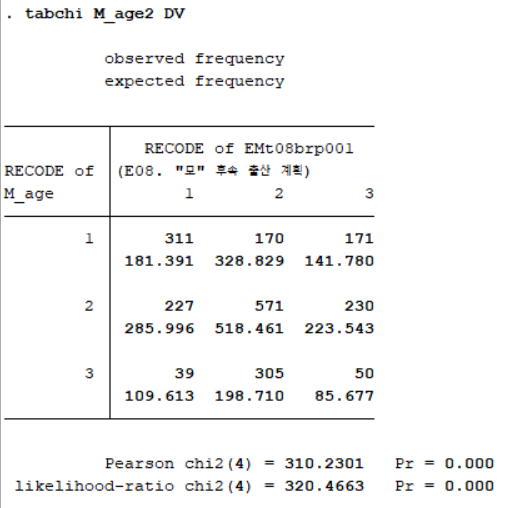 이전 포스팅에서 이미 모 연령의 응답 범주를 19~24세, 25~29세, 30~34세, 35~39세, 40~46세로 수정하여 M_age라는 변수로 저장을 해두었다. 이를 다시 19~29세, 30~34세, 35세 이상으로 수정해서 M_age2라는 변수로 생성하였다.