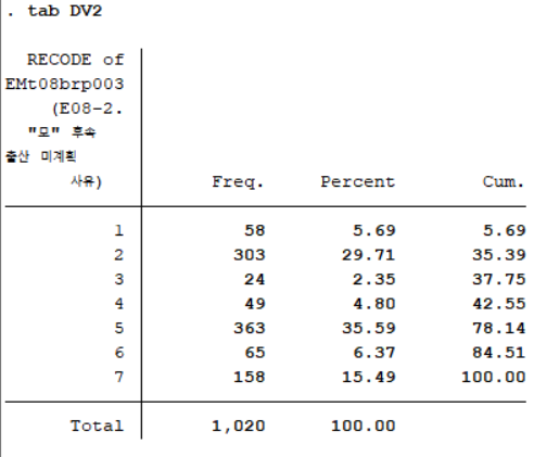 어머니의 후속 출산 미계획 사유 변수(EMt08brp003) 중 무응답 값을 결측치로 저장하여 새로운 변수(DV2)에 저장하였다. 해당 변수에 대한 빈도분포를 살펴보면 아래 사진과 같다. 사진에서와 같이 기존 변수를 recode한 경우 stata 프로그램에서 자동으로 label에 어떠한 변수를 recode하였는지 표기가 된다(RECODE of EMt08brp003). 하지만 응답값에 대한 label이 변경이 되었기 때문에 1, 2, 3,... 7과 같이 숫자로만 표기가 될 뿐 각각의 값이 어떠한 의미를 가지는지는 알 수 없다. 사실 분석을 하면서 이런 개별 응답값에 대한 labeling 작업을 하는것이 번거롭기는 하지만, 해당 데이터를 여러 번 반복 작업을 해야 한다면 귀찮더라도 그 때 그 때 라벨링을 해주는 것이 좋다. 이전 포스팅에서 라벨링 작업을 설명한 적이 있으므로, 일단 여기서는 라벨링 작업을 스킵하고 교차분석 단계로 넘어가도록 하겠다.