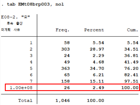 서미정(2011)은 후속 출산계획에 대해 ‘낳지 않겠다’고 응답한 조사대상자들의 추가 출산하지 않는 가장 큰 이유를 자녀수 및 모 연령에 따라 교차분석하였다. 후속 출산 미계획 사유에 대한 한국아동패널의 데이터 변수는 EMt08brp003이다. 먼저 해당 변수의 빈도분포를 보기 위해 tab 명령어를 실행한다.
