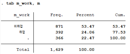 tab의 옵션으로 missing을 추가하였더니 결측치가 366 케이스가 있음을 확인할 수 있다. 이들은 해당 연구의 관심대상자가 아니기 때문에 최종 표본에서 이들을 제외시켜야 하므로 명령어 drop을 사용한다. 구체적으로 drop에 if 조건문을 사용하여 m_work라는 변수 중 결측치(.)로 코딩되어 있는 경우를 제외시킨다.