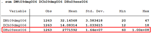 먼저 인구사회학적 특성으로 살펴본 변수들 중 결측치가 없는지 살펴볼 필요가 있다. 연속변수인 어머니의 연령(DMt09dmg006), 아동 월령(DCh09dmg006), 월 가구소득(DHu09ses006)은 간단히 sum 명령어를 이용해 변수의 평균과 표준편차, 최솟값과 최댓값을 살펴보자.