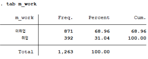 tab의 옵션으로 missing을 추가하였더니 결측치가 366 케이스가 있음을 확인할 수 있다. 이들은 해당 연구의 관심대상자가 아니기 때문에 최종 표본에서 이들을 제외시켜야 하므로 명령어 drop을 사용한다. 구체적으로 drop에 if 조건문을 사용하여 m_work라는 변수 중 결측치(.)로 코딩되어 있는 경우를 제외시킨다.