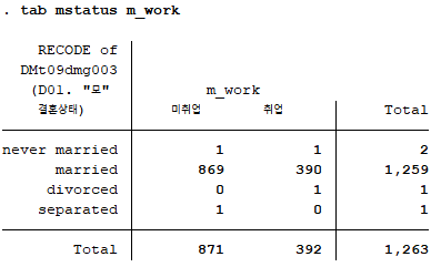 이제 취업모/미취업모에 따른 명목변수(혹은 서열변수)의 특성을 보자. 이 때 사용할 명령어는 tab인데 신나리, 안재진(2014)이 제시한 Table 1과 같이 N과 %를 모두 나타낼 것이다. 이를 위해서는 명령어 tab과 이의 옵션인 row 또는 col을 사용할 것이다. Row는 각 셀의 행 내에서 상대빈도를 보고하는 옵션이며, col은 각 셀의 열 내에서 상대빈도를 알려주는 옵션이다. 예시로 어머니의 결혼지위 변수를 살펴보자.