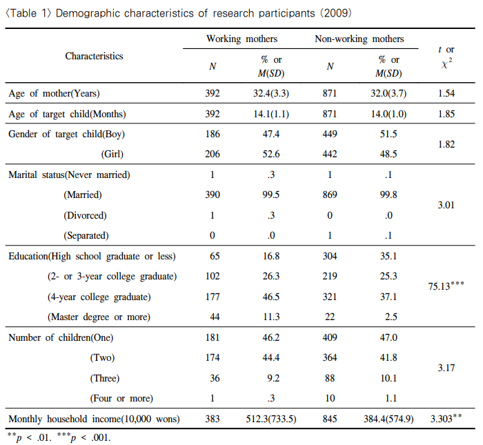일반적으로 연구방법 세션에 연구대상에 대한 사회인구학적 특성을 기술하는 부분이 있다(이전 포스팅 참고). 신나리, 안재진(2014) 역시 연구방법에서 연구대상자의 인구학적 특성을 Table 1로 제시하였다. 구체적으로 미취업모 집단과 취업모 집단을 구분하여 어머니의 연령, 자녀 월령, 자녀 성별, 어머니의 결혼지위, 어머니의 최종학력, 자녀 수, 월 가구소득을 제시하였다. 더불어 해당 연구에서 미취업모와 취업모 집단의 특성을 구분하여 살펴보는데 초점이 맞춰져 있으므로, 인구학적 특성에 있어 집단 간 차이가 나는지 살펴보기 위해 t 혹은 카이제곱 검정을 실시하였다.