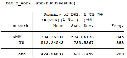 먼저 연속변수부터 살펴보자. 취업모와 미취업모 개별 연속변수의 통계치를 보기 위해 sum을 이용할 수도 있고, tab을 사용할 수도 있다. 예를 들어, sum을 활용한다면 그룹 구분을 위해 만들었던 변수 'm_work'를 활용하여 다음과 같은 명령어를 입력한다.