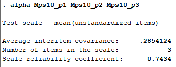 명령어를 입력하면 위의 사진과 같이 결과가 나오는데, scale reliability coefficient 부분이 크론바하 알파값이다.