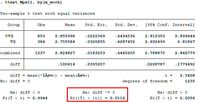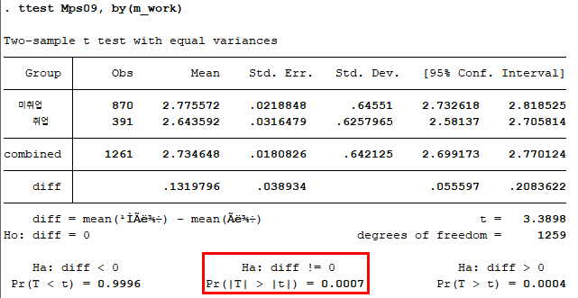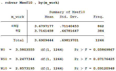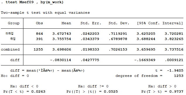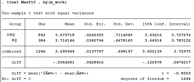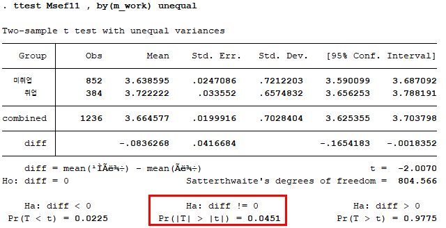 앞선 분석결과에서 4차년도 자기효능감의 등분산성 가정이 충족되지 않아, ttest 옵션으로 unequal을 추가하였다. 분석 결과, 어머니의 취업 여부에 따른 자기효능감 차이가 4차년도에서만 나타났다. 사실 이는 신나리, 안재진(2014)의 결과와 반대되는데, 이는 데이터 분석을 논문에 기재된 설명만을 보고 따라하여 실수가 있을 수도 있고 혹은 분석 프로그램의 차이에 기인한 것일 수도 있다. 이유가 무엇이든간에 해당 포스팅의 주요 초점은 데이터 분석을 위해 Stata 명령어와 친숙해지는 것이기 때문에 이러한 부분에 대해서는 넘어가도록 한다.