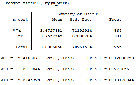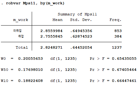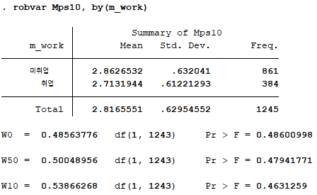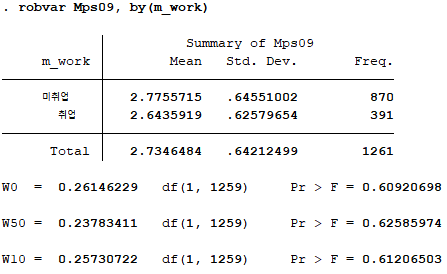 주요 변수인 양육스트레스와 자기효능감이 어머니의 취업 여부에 따라 유의한 차이를 보이는지 분석하기 위해 t검정을 실시한다. t검정을 실시하기 위해서는 먼저 두 집단 간 등분산성이 성립하는지 알아보기 위해 robvar라는 명령어를 실행하고, 그 후 t검정 실시를 위해 ttest라는 명령어를 이용할 것이다.