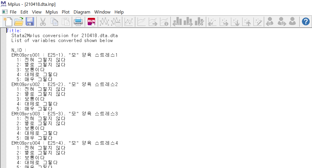 그렇다면 이제 Mplus 프로그램을 열어 변환된 '210418.dta.inp' 파일을 열어보자.