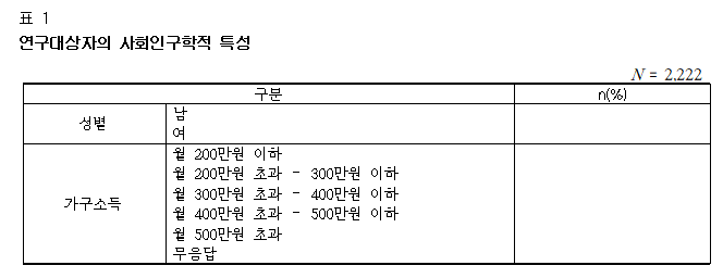 물론 반드시 세로줄이 없어야 하는 것은 아니다. 필요에 따라 세로줄이 있어야 표를 보기 좋은 경우에는 세로줄을 삽입하여도 된다. 대신 양쪽 끝에 세로줄은 반드시 비워놓는 편이다. 이러한 표의 형식은 논문작성의 기본적인 약속과 같은 것이어서 크게 중요해 보이지는 않지만, 이런 부분에서 실수를 하면 논문에 신경을 쓰지 않는다는 인상을 줄 수 있으므로 반드시 확인해볼 필요가 있다.