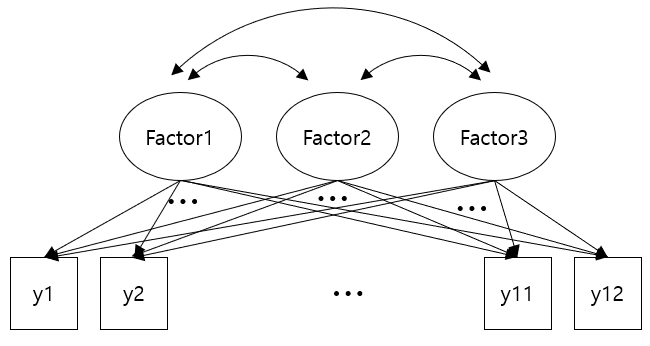 그렇다면 관찰변수와 잠재변수의 관계에 가설이 있는 확인적 요인분석의 코드는 어떻게 작성하면 될까?