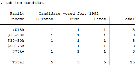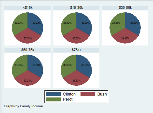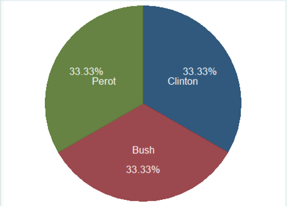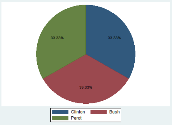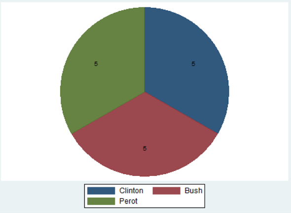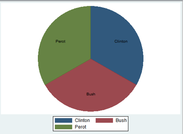 위의 세 가지 파이그래프를 비교하면 알 수 있듯이, _all name은 라벨명을 붙이는 옵션으로 유권자(voter)의 범주명인 Clinton, Bush, Perot이 기입되었다. 가운데 _all sum의 실행결과에서는 해당 범주에 속하는 사례수가 적혀있으며, 맨 오른쪽 _all percent 옵션 결과에서는 범주별 퍼센티지가 나와있다.