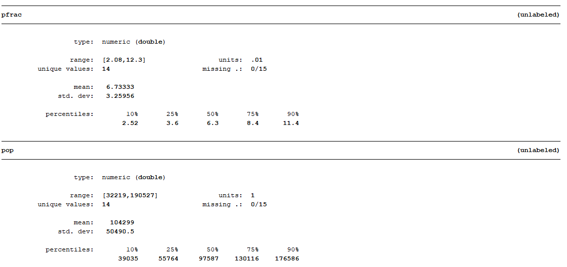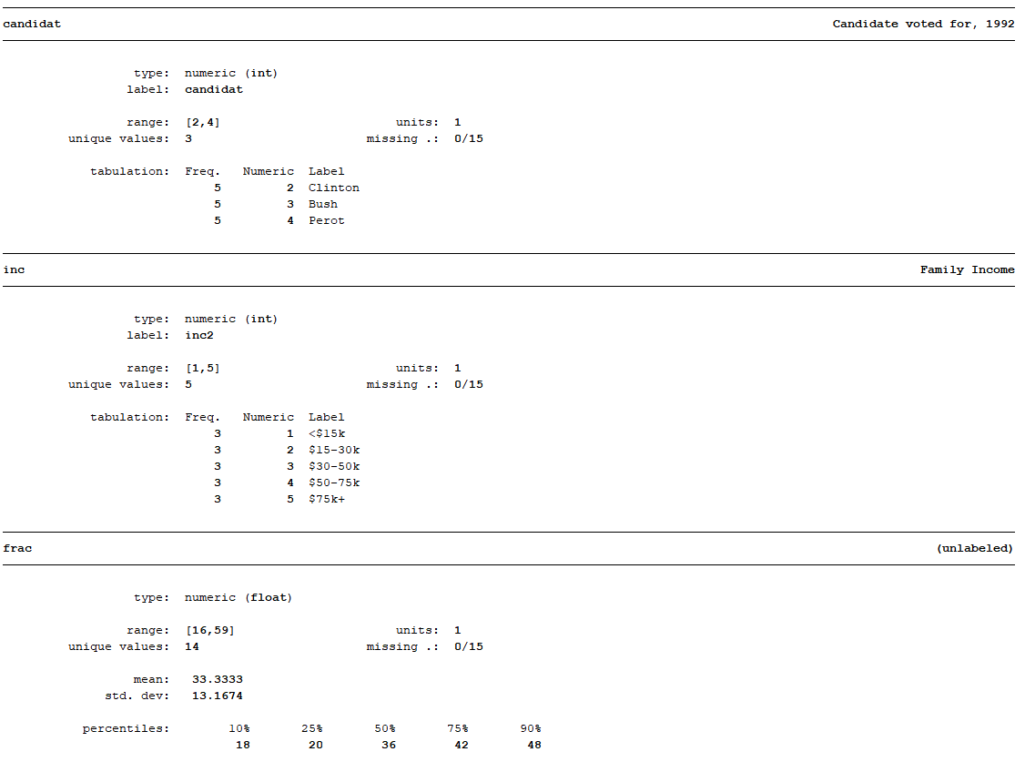 codebook은 변수의 속성과 코딩이 어떻게 이루어져있는지 파악하는데 사용되는 명령어로, 아래 사진과 같이 개별 변수의 유형, 라벨, 범위, 결측치, 간단한 빈도표 등을 간단하게 확인할 수 있다. candidat, inc와 같은 범주형 변수는 간단한 빈도표를 제시한 반면 frac, pfrac, pop과 같은 연속 변수는 평균과 표준편차, 10%퍼센타일/25%퍼센타일/50%퍼센타일/75%퍼센타일/90%퍼센타일과 같이 간단한 기초통계값도 제시해주고 있다.