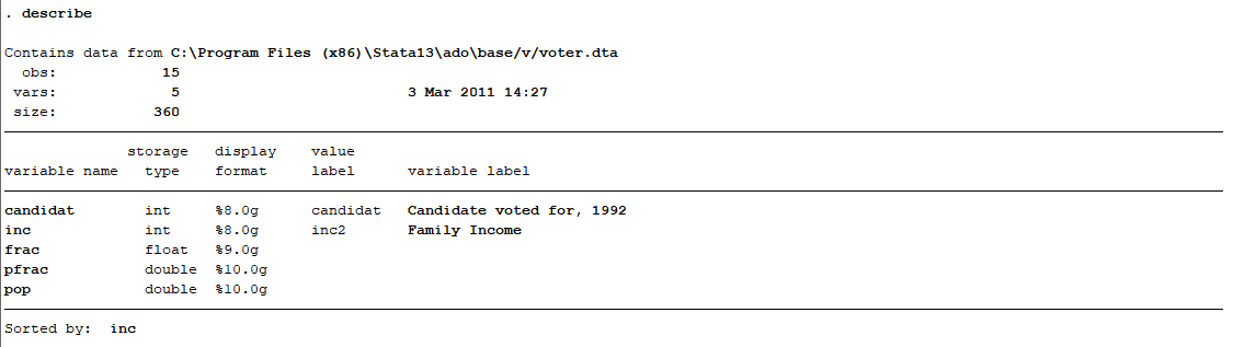 먼저 stata 데이터셋 중 유권자에 대한 정보를 담은 'voter' 파일을 명령어 sysuse로 불러올 것이다.