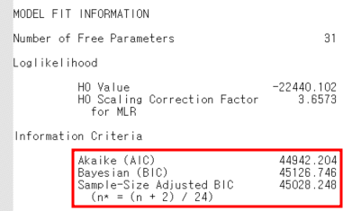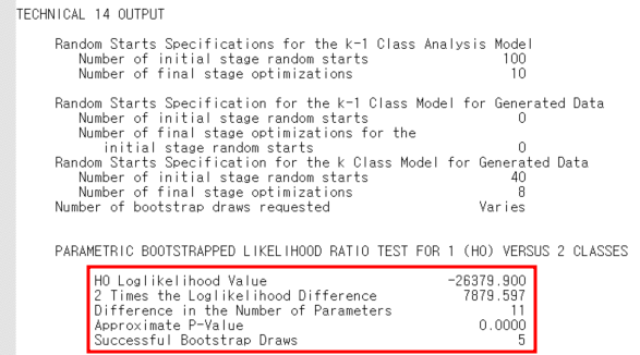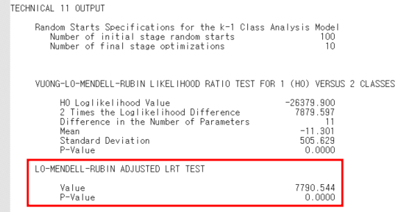 맨 왼쪽 사진의 빨간 네모 안에서는 AIC, BIC, Sample-Size Adjusted BIC 값을 확인할 수 있고, 가운데 사진은 OUTPUT에서 tech11의 분석결과인 LMRLT의 p-value를 확인할 수 있다. 마지막으로 오른쪽 사진은 tech14의 분석결과인 BLRT의 p-value를 확인할 수 있는데, approximate p-value 값을 논문에 보고하면 된다.