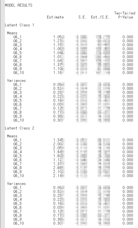위의 사진은 CLASSES = c(2); 즉, 잠재집단을 2개라고 가정했을 때의 결과를 캡처한 사진이다.