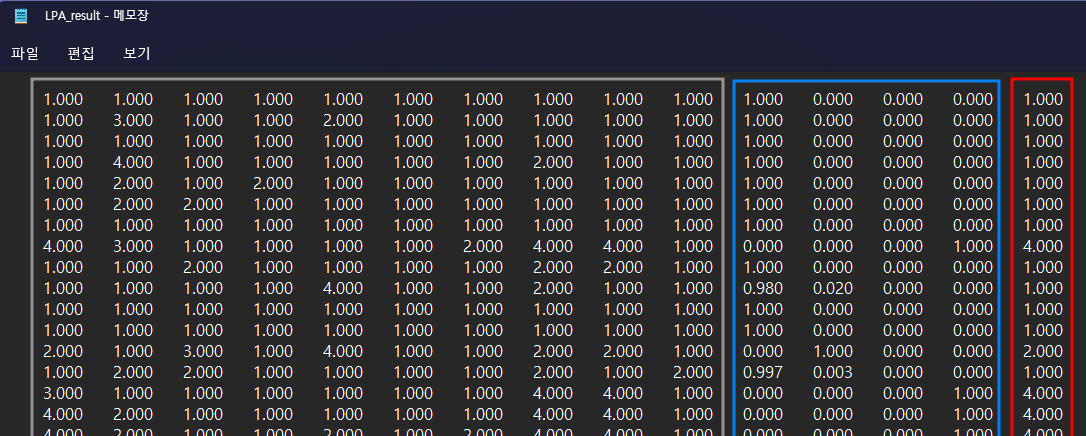 위의 syntax를 입력하고 난 뒤 분석이 종료되면, 지정된 경로에 'LPA_result'라는 텍스트 파일이 저장되어 있는 것을 확인할 수 있다. 해당 파일을 열어보면 아래 오른쪽 그림과 같이 생겼는데, 왼쪽에서부터 10번째 열까지는 원래 데이터의 변수였던 Q6_1~Q6_10의 값이 들어가있고(회색 네모), 그 옆의 4개의 열은 4개의 개별 잠재계층에 속할 확률을 뜻한다(파란 네모). 그리고 마지막 빨간 네모 안이 최종적으로 분류되는 잠재계층으로, 예를 들어, 사진에서 첫 번째 줄의 ID는 1번 잠재계층에 속한다는 것을 의미한다.