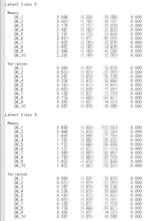 위에서의 syntax 부분에서 CLASSES = c(2);를 CLASSES = c(4);로만 바꾸고 분석을 돌린 다음, MODEL RESULTS 부분에서 4개의 잠재유형에 대한 기초통계값을 확인할 수 있다.