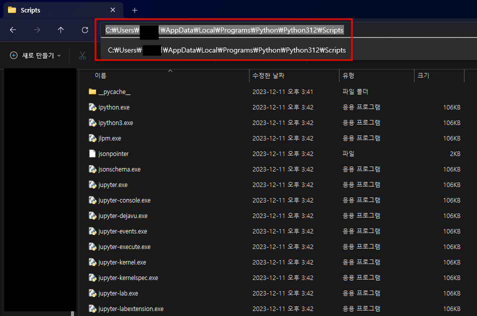 2. C:\Users\ [사용자 이름 폴더명] \AppData\Local\Programs\Python\Python312\Scripts