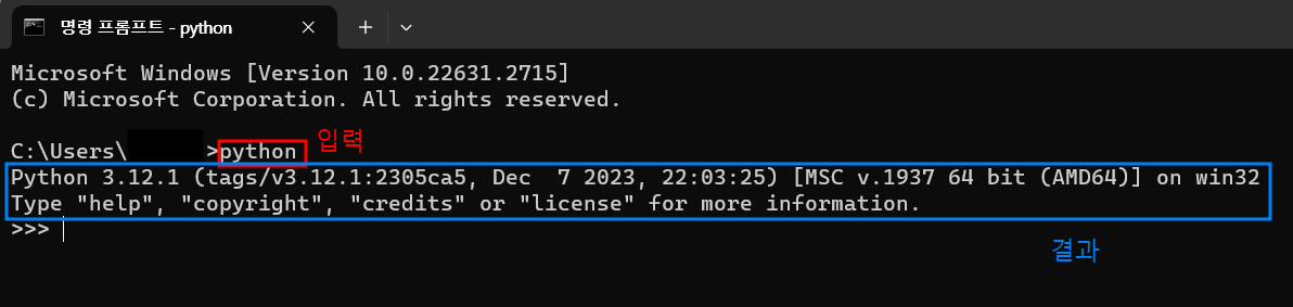 명령 프롬프트를 클릭하면 검은색 창이 뜰 것인데 여기에 'python'을 입력하면 아래 사진에서와 같이 설치된 파이썬 버전을 알려준다(Python 3.12.1).