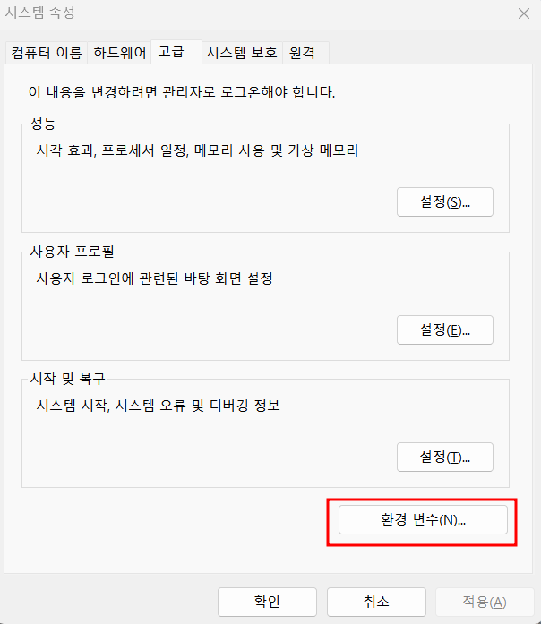 (2) 시스템 속성 > 고급 > 맨 아래 '환경 변수' 클릭
