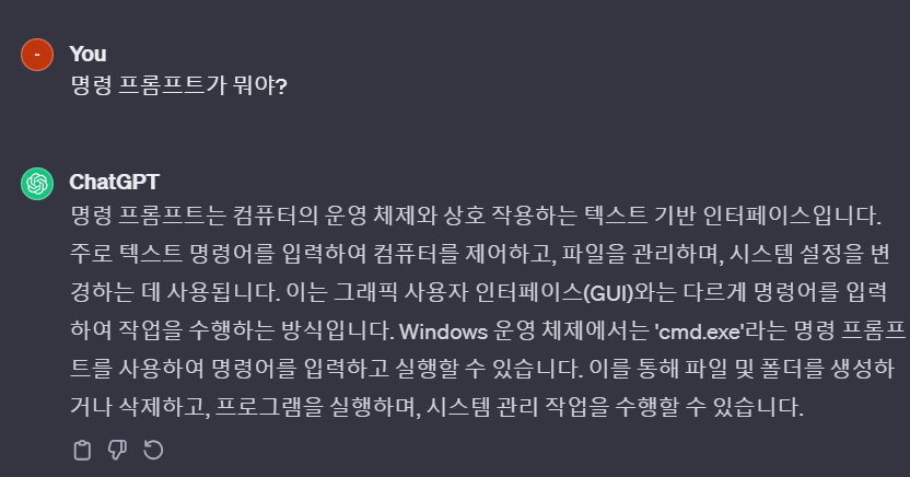 파이썬 설치가 잘 되었는지 확인하기 위해, 명령 프롬프트를 열어본다. 명령 프롬프트를 열기 위해서는 윈도우 검색창에 'cmd'를 입력하면 아래 왼쪽 사진과 같이 '명령 프롬프트'라는 결과가 뜰 것이다. 처음 파이썬을 배울 때, 명령 프롬프트가 뭔가 했는데 필자가 이해한 바로는 컴퓨터에게 텍스트로 명령을 내리는 하나의 방식이다. (물론 필자는 컴퓨터를 잘 모르기 때문에 chatGPT한테 물어보았다ㅎㅎ)