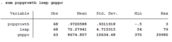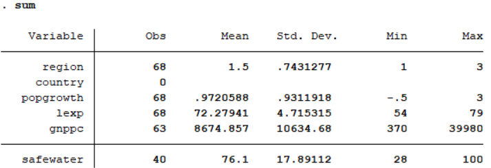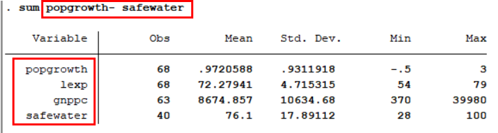 sum 뒤에 변수를 일일히 나열하기 귀찮은 경우 -를 사용하면 popgrowth와 safewater를 포함하여 그 사이에 있는 변수들의 기초통계값을 제공한다.