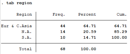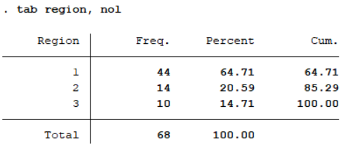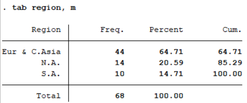 추가로 다른 옵션인 ,m 혹은 ,missing을 붙여주면 결측값까지 포함한 빈도분포표를 제시해준다. 다만 region이라는 변수에서는 결측값이 없어서 해당 옵션을 붙여도 동일한 결과를 얻게 된다.