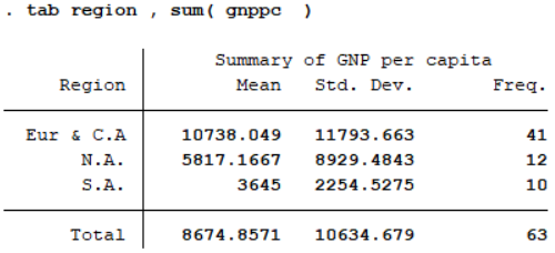 tab + 변수명1, sum (변수명2) : 변수1의 분류에 따라 변수2의 평균, 표준편차를 제공하는 명령어