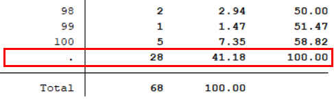 tab + 변수명, missing : 결측값을 포함하여 해당 변수의 빈도를 제공하는 명령어