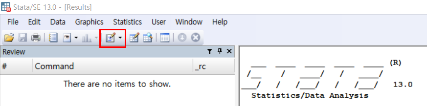 Stata 프로그램을 켰을 때, 상단 메뉴에서 빨간 네모를 클릭하면 Do-file editor가 열린다.