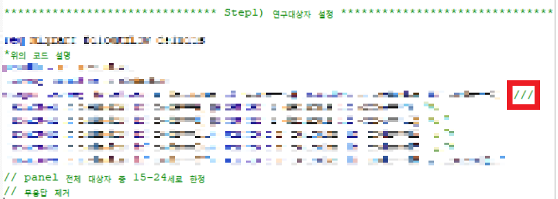 그런데 코드 한 줄 한 줄마다 저렇게 별 표를 붙여 설명을 달면 개인적으로는 지저분하게 느껴져, 맨 아래에 쭉 설명을 쓰는 것을 선호하는 편이다. 이것도 개인마다의 취향이니, 본인이 do file을 작성하면서 편한 방식을 채택하면 된다. 예시로 패널 데이터를 사용 중인데, 연구대상자로 15-24세를 선정하고 무응답을 제거했다는 내용을 간단히 기입하였다. 이렇게 해두면 나중에 코드를 보면서 오류가 있는지 없는지 확인하기도 쉽다.