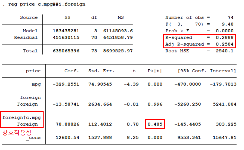만약, 여기서 연구자가 연비(mpg)와 차 종류(foreign) 간에 상호작용 효과가 있는지 궁금하다고 해보자. 그러면 상호작용항을 투입해줘야 하는데, 이를 위한 코드는 다음과 같다(둘 중 아무거나 입력하면 된다).