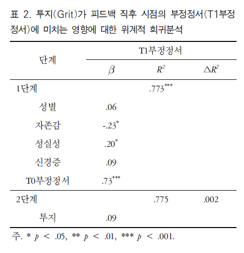위계적 회귀분석에서는 독립변수의 투입 순서를 연구자가 결정하는데, 투입 단계에 따라 괄호로 구분하여 command를 입력하면 된다. 즉, 위의 논문을 예시로 1단계에서 성별/자존감/성실성/신경증/T0부정정서가, 2단계에서 투지가 독립변수로 투입되는데 Stata에서는 이를 (성별 자존감 성실성 신경증 T0부정정서) (투지)와 같은 형태로 입력하면 된다.