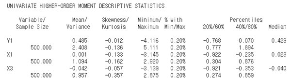 사진에서와 같이 변수 y1, x1, x3의 n값과 평균, 분산, 왜도/첨도, 최솟값/최댓값, 백분위수, 중앙값이 표기된다.
