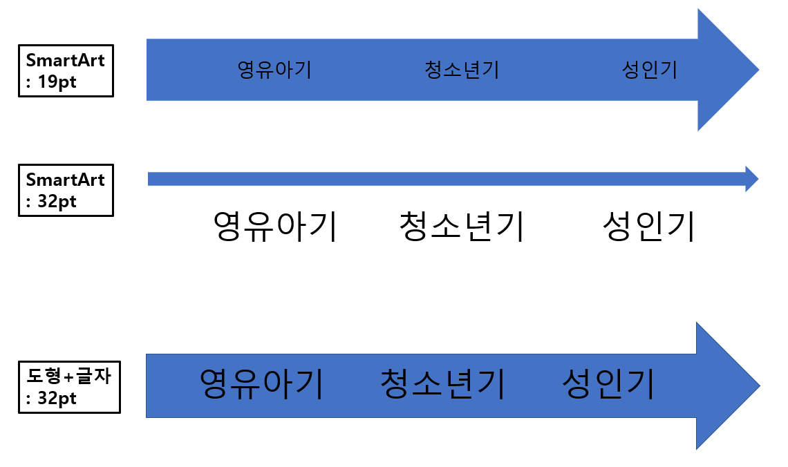 위의 이미지를 적절히 활용하는 것과 더불어 파워포인트 '메뉴>일러스트레이션>SmartArt'라는 기능을 적절히 사용하여 ppt를 만드는 것도 좋은 방법이다. SmartArt에는 목록형, 프로세스형, 주기형, 계층 구조형, 관계형, 행렬형, 피라미드형, 그림으로 그래픽을 분류해두었다. 자신의 논리를 설명하는데 적절한 그래픽을 골라 사용하면 되는데, 개인적으로 목록형과 주기형, 계층 구조형의 그래픽을 많이 사용하는 것 같다. 다만 SmartArt를 사용할 때 도형 크기에 비해 글자가 너무 작아지는 문제가 있는데(글자를 키우면 도형 모양이 이상해지거나 줄바꿈이 되는 등), 이런 경우에는 그냥 SmartArt의 그래픽을 참고하여 도형과 글상자를 따로 만든 뒤 그룹화하는게 편할 때도 있다.