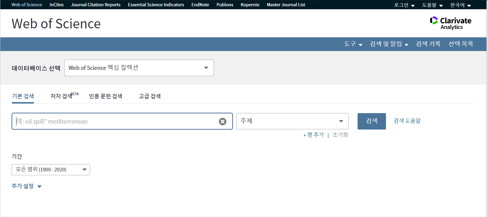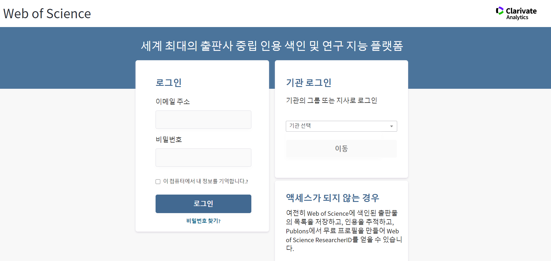 Web of Science의 사이트 주소는 www.webofknowledge.com으로 바로 사이트에 접속하면 아래 사진과 같은 화면이 뜰 것이다.