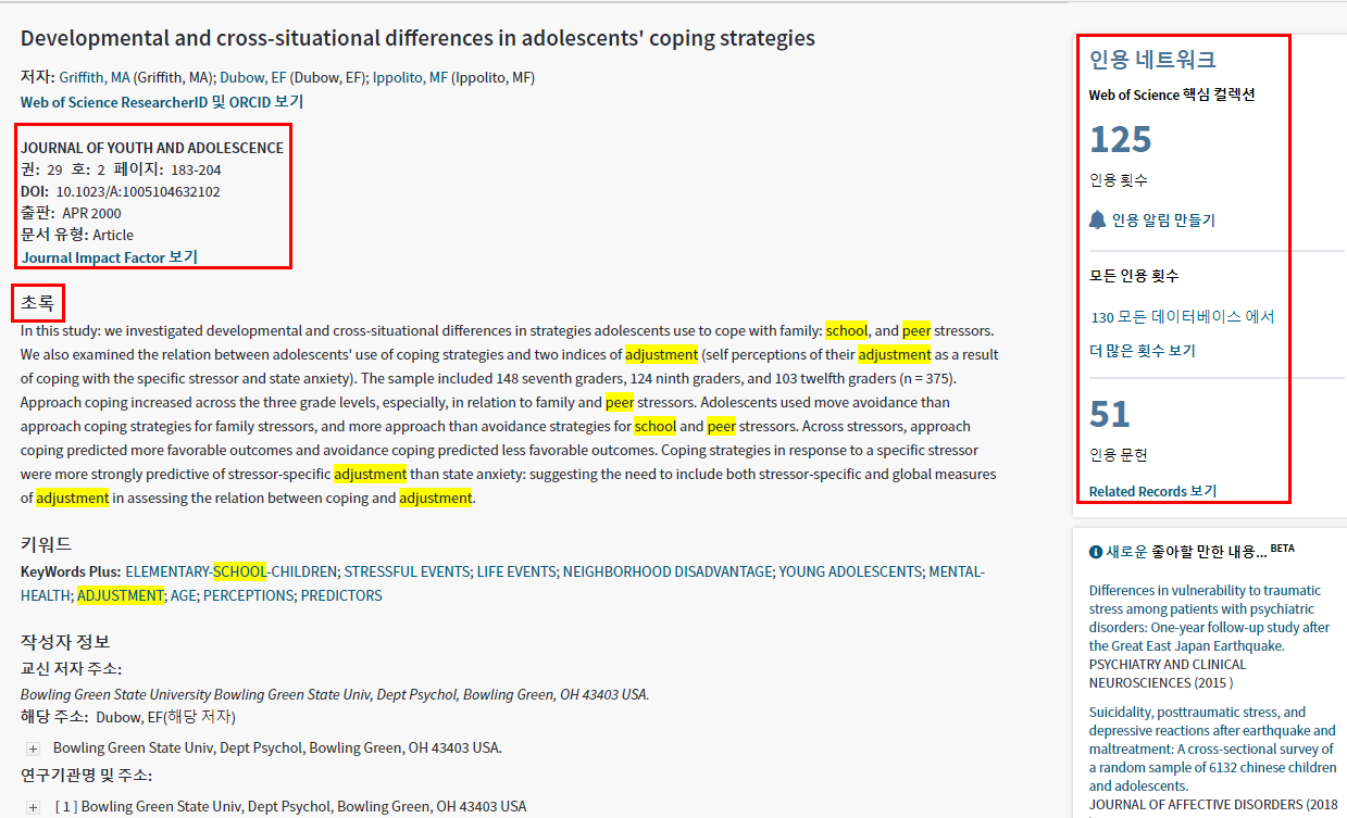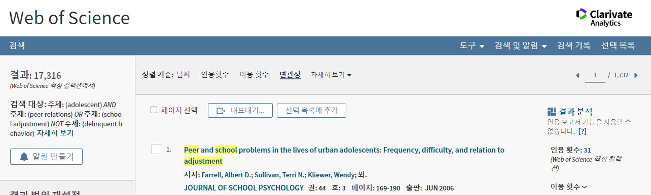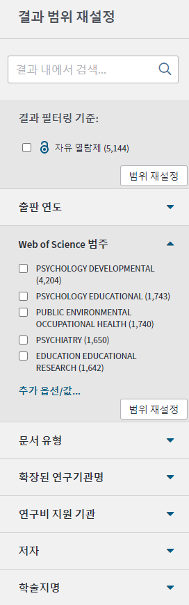 또한 지금과 같이 17,316편이라는 어마어마한 양의 논문이 검색되었을 경우에는 왼쪽의 '결과 범위 재설정'이라는 기능을 통해 검색 결과를 추릴 수 있다. 범위 내 키워드를 다시 검색할 수도 있고, 출판 연도를 설정하거나, 학술분야를 지정하든지(Web of Science 범주), 구체적인 저자나 학술지명을 선택할 수도 있다.